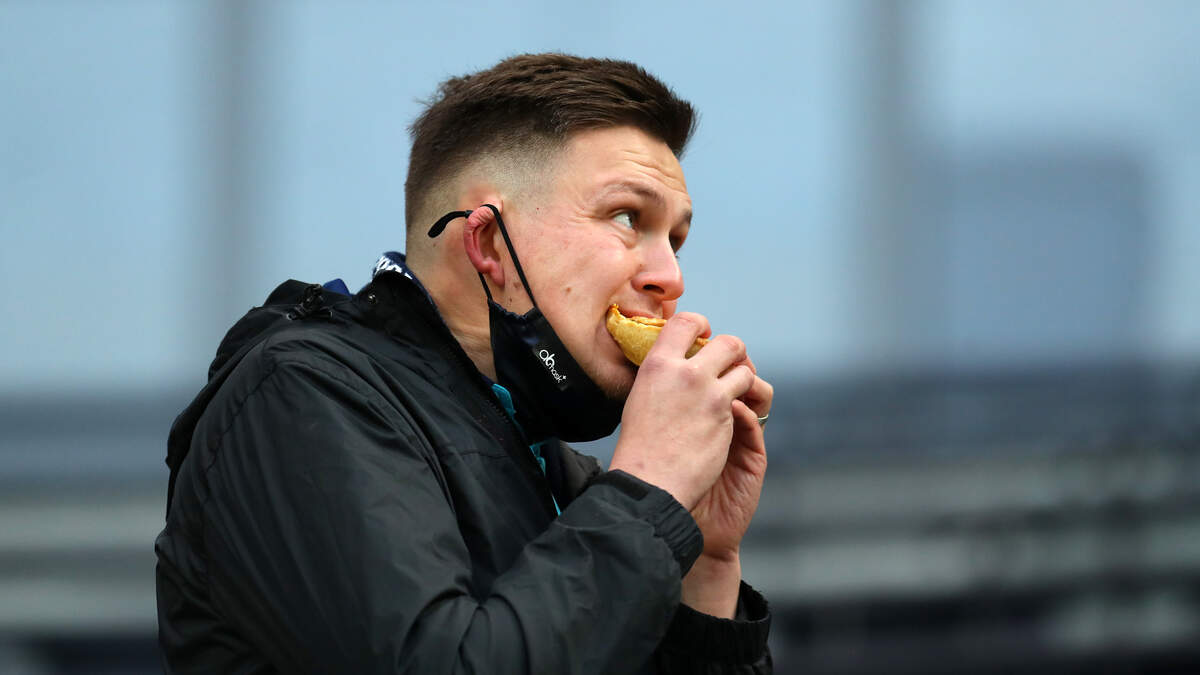 The two people then remove their regular masks, revealing a smaller face mask that covers only their noses, allowing them to eat and drink without issue.
